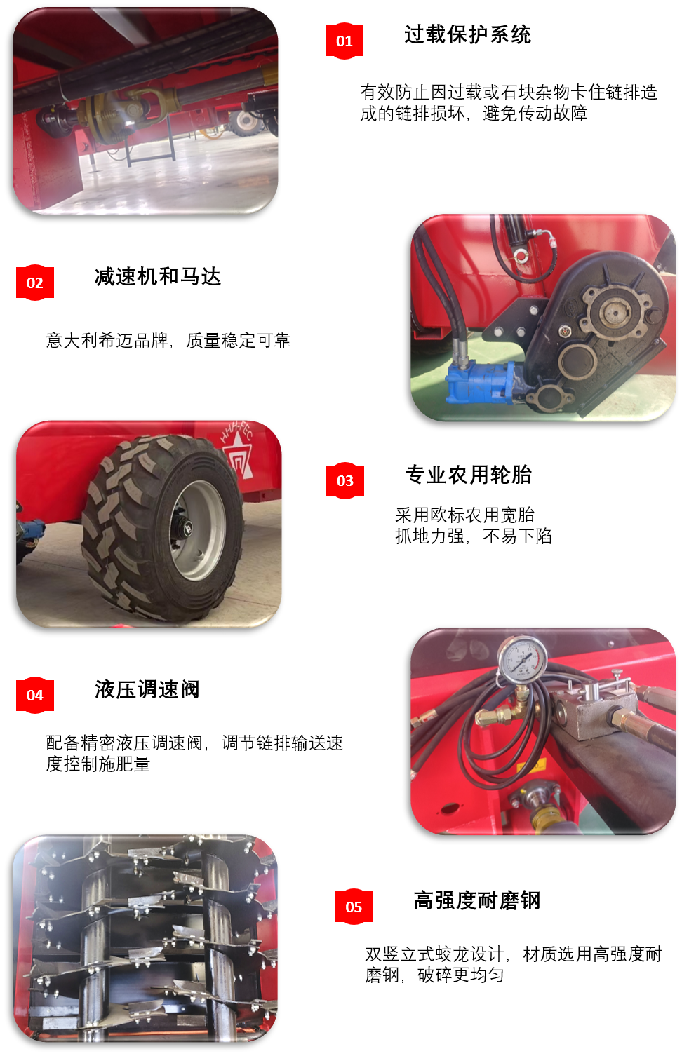 3. 自動化操作:輸送鏈排均采用高強度礦用圓環(huán)鏈材質,鏈排為活結浮動式結構, 保護鏈排的同時更好的適應復雜物料的拋撒。雙豎絞龍撒肥機可以自動控制施肥量、施肥速度和撒肥范圍,減少人力成本,提高作業(yè)效率。